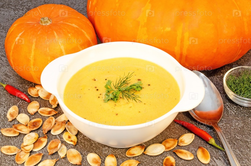 Горячий тыквенный суп-пюре на деревянном столе