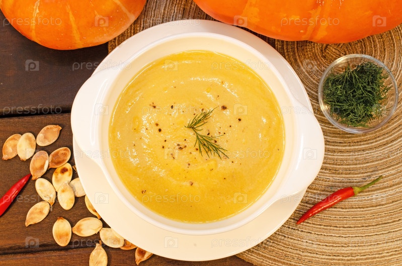 Горячий тыквенный суп-пюре на деревянном столе