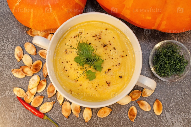 Горячий тыквенный суп-пюре на деревянном столе