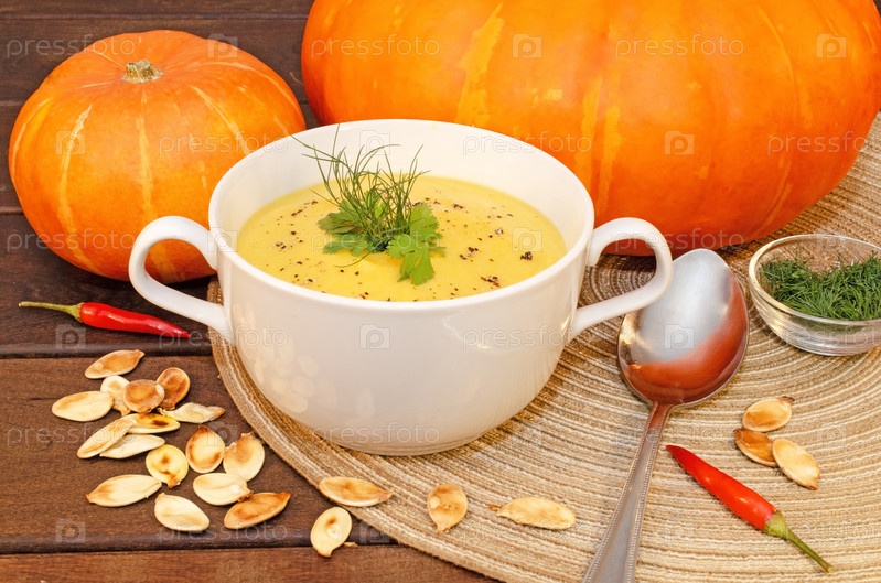 Горячий тыквенный суп-пюре на деревянном столе