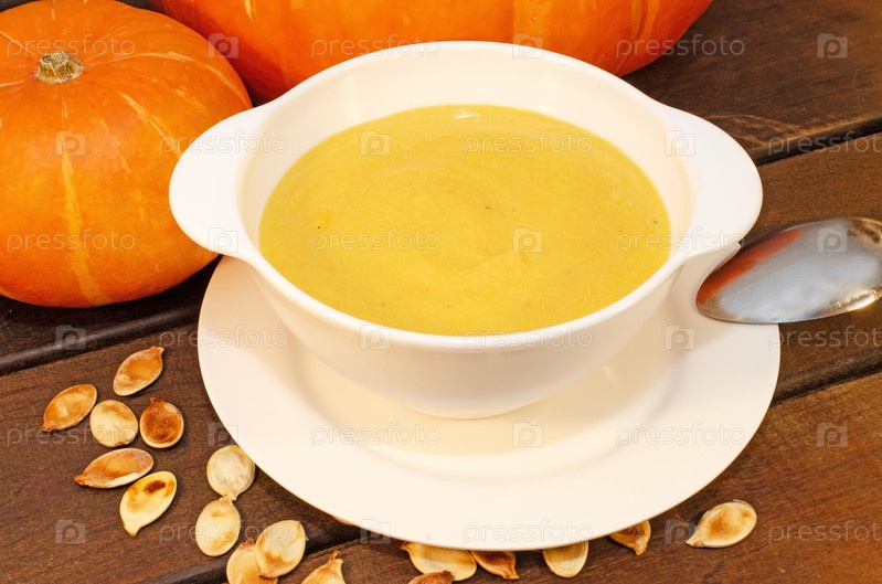 Горячий тыквенный суп-пюре на деревянном столе