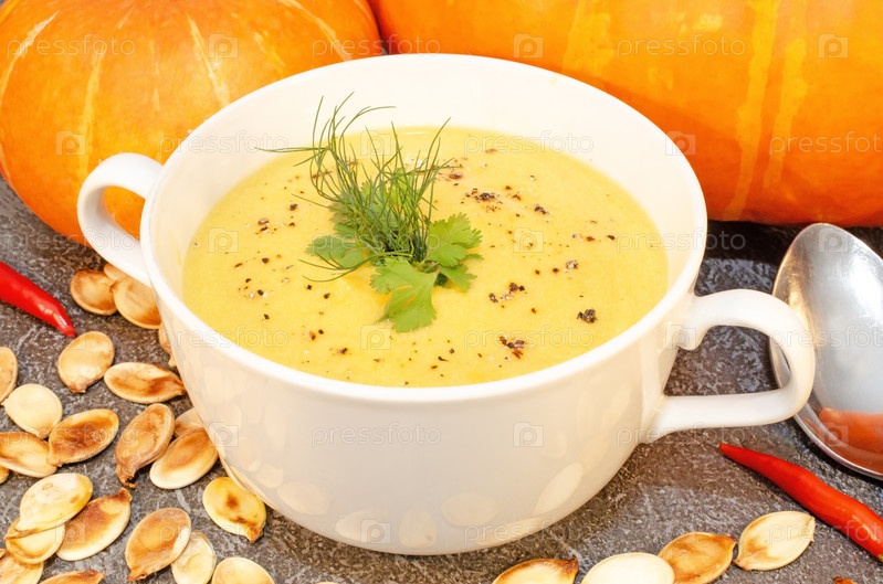 Горячий тыквенный суп-пюре на деревянном столе