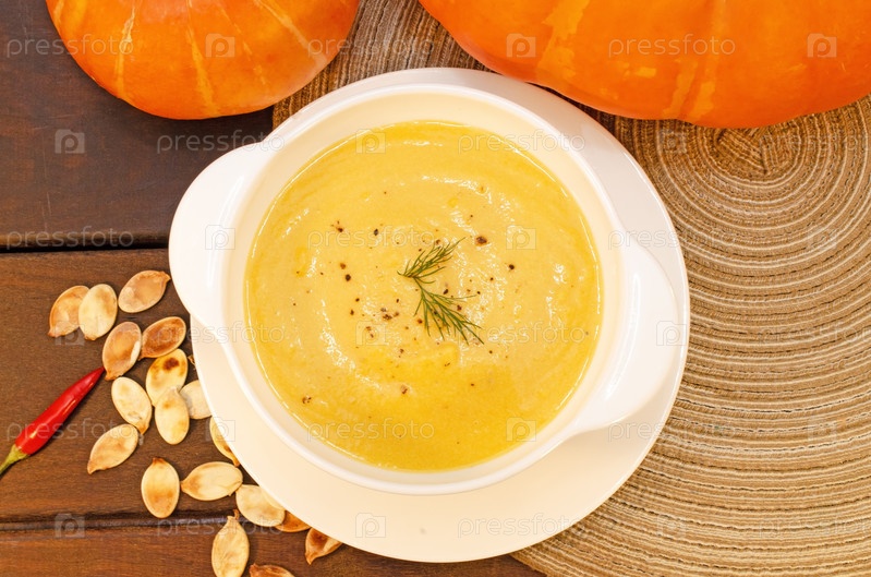 Горячий тыквенный суп-пюре на деревянном столе