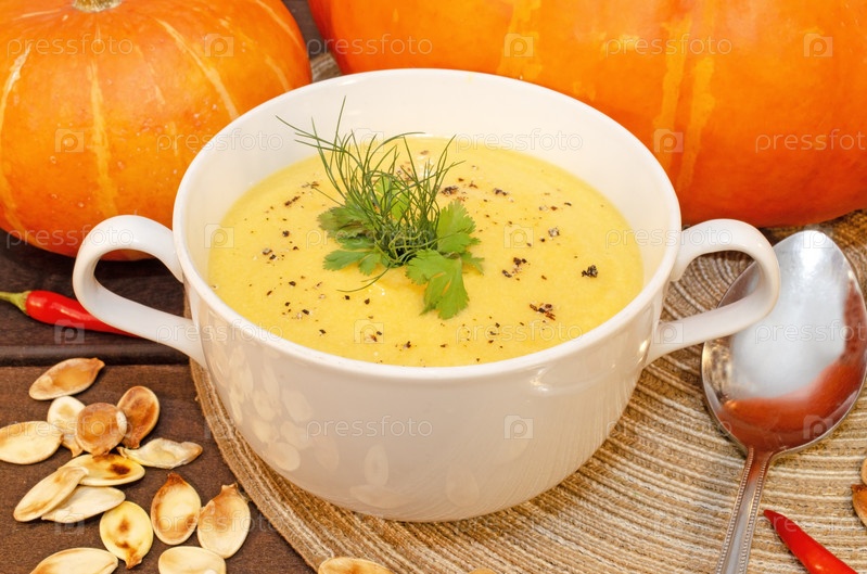 Горячий тыквенный суп-пюре на деревянном столе