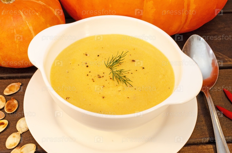 Горячий тыквенный суп-пюре на деревянном столе