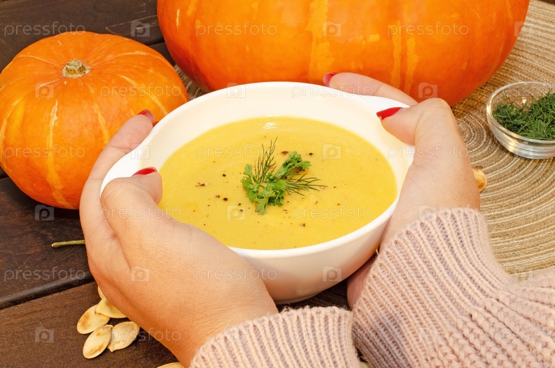 Тыквенный горячий суп-пюре и тыквы на деревянном столе