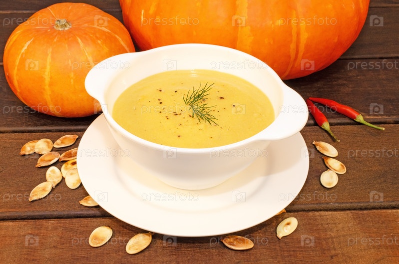Горячий тыквенный суп-пюре на деревянном столе