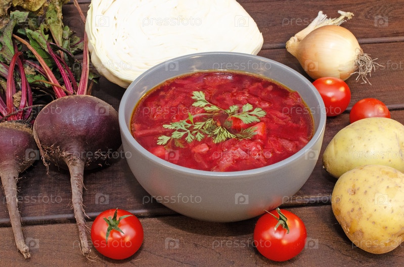 Борщовый суп с овощами и мясом на деревянном столе