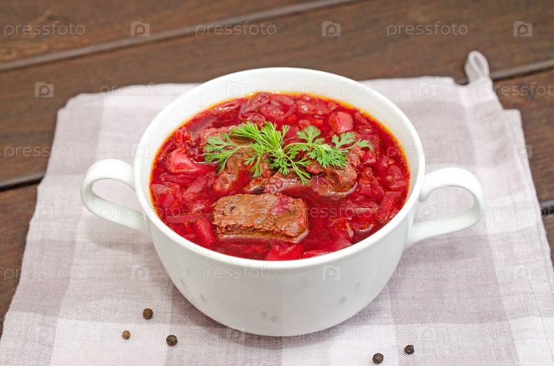 Борщовый суп с овощами и мясом на деревянном столе