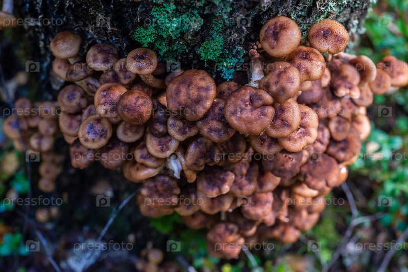 Грибы. Опята. Опета на дереве. Свежие, ароматные опеты выросли на дереве в сентябре. Грыбы. Медовая ткань. Медовая ткань на дереве. Свежие, благоухающие медовые грибы росли на дереве в сентябре