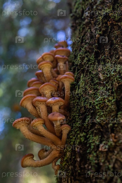 Грибы. Опята. Опета на дереве. Свежие, ароматные опеты выросли на дереве в сентябре. Грыбы. Медовая ткань. Медовая ткань на дереве. Свежие, благоухающие медовые грибы росли на дереве в сентябре