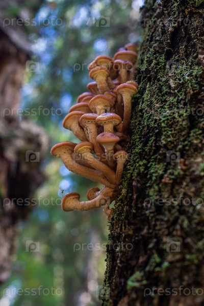 Грибы. Опята. Опета на дереве. Свежие, ароматные опеты выросли на дереве в сентябре. Грыбы. Медовая ткань. Медовая ткань на дереве. Свежие, благоухающие медовые грибы росли на дереве в сентябре