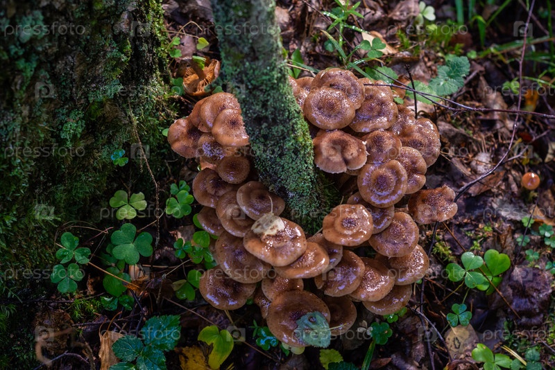 Грибы. Опята. Опета на дереве. Свежие, ароматные опеты выросли на дереве в сентябре. Грыбы. Медовая ткань. Медовая ткань на дереве. Свежие, благоухающие медовые грибы росли на дереве в сентябре