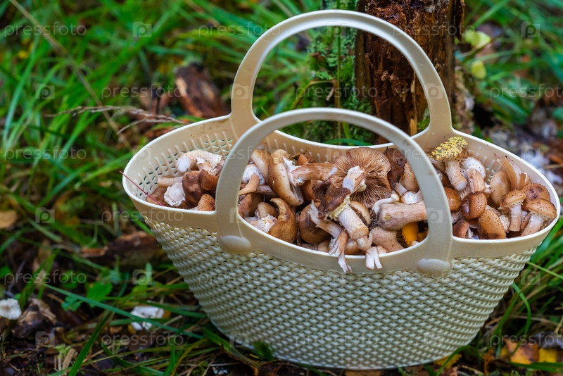 Грибы. Опята. Полная корзина ароматных съедобных грибов, собранных в лесу. Грибки. Медовая роса. Полная корзина благоухающих съедобных грибов, которые были собраны в лесе