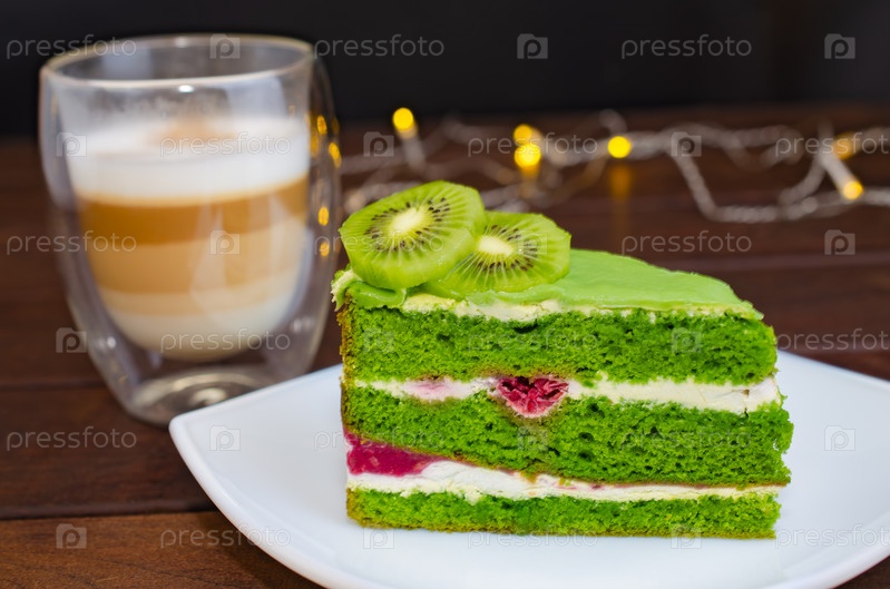 Фисташковый торт с начинкой из киви, сливок и малины и кофе «Капучино»
