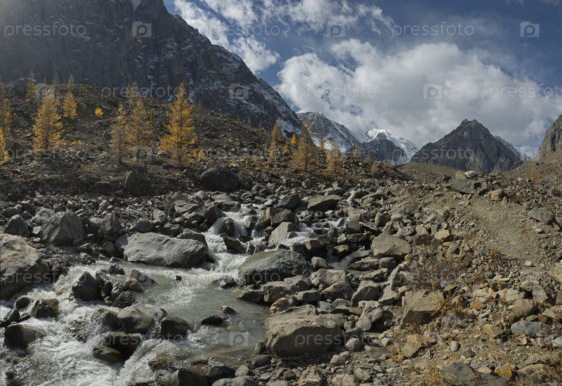 Россия. Юг Западной Сибири, Горный Алтай. Осенний вид на долину реки Актру, исток которой расположен у подножия ледника Северо-Чуйского хребта