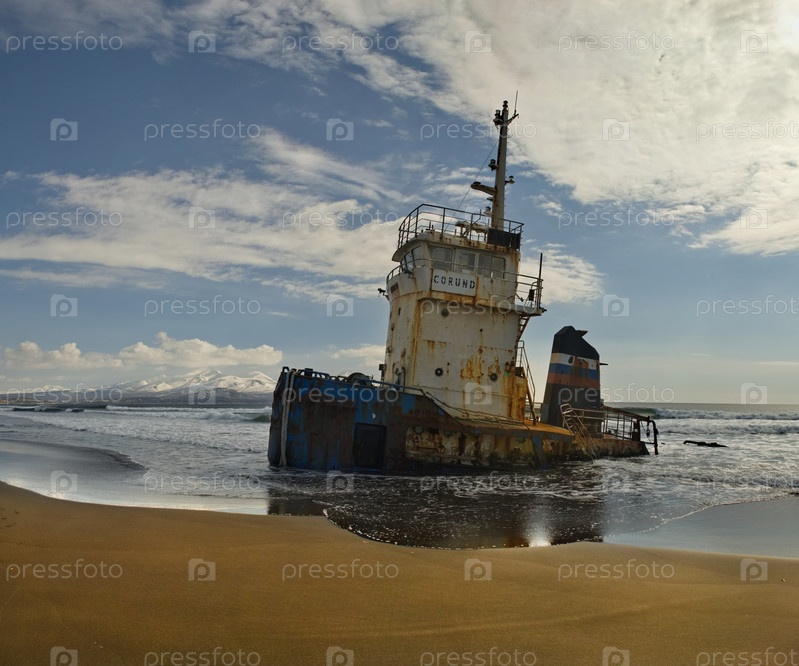 Россия. Дальний Восток, Курильские острова, остров Итуруп. Увяз в вулканическом прибрежном песке буксир «Корунд», который в 2015 году был выброшен на берег во время зимнего шторма