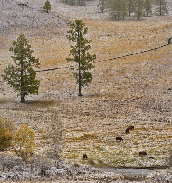 Россия. Юг Западной Сибири, Горный Алтай. Первый осенний снег на Чуйском шоссе возле села Шебалино в окружении заснеженных гор
