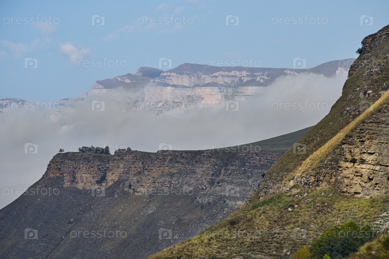 Россия. Приэльбрусье. Высокие горные вершины Северного Кавказа окружены утренними туманными облаками, зависшими на разных уровнях недоступных скал