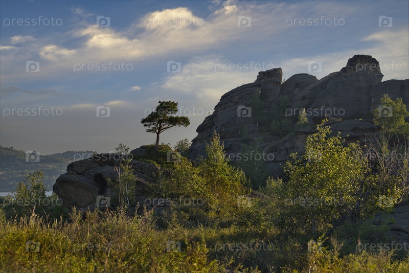 Россия. Алтайский край. Живописные скальные обнажения на берегу озера Колывань, расположенного недалеко от границы с Казахстаном, на фоне яркого закатного неба