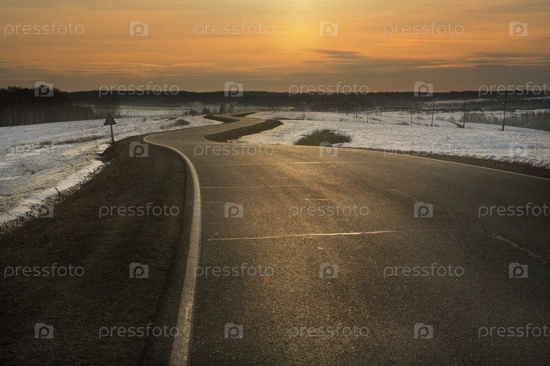 Россия. Юг Западной Сибири, Алтайский край. Вид на зигзагообразную дорогу, уходящую за горизонт, на фоне восходящего весеннего солнца
