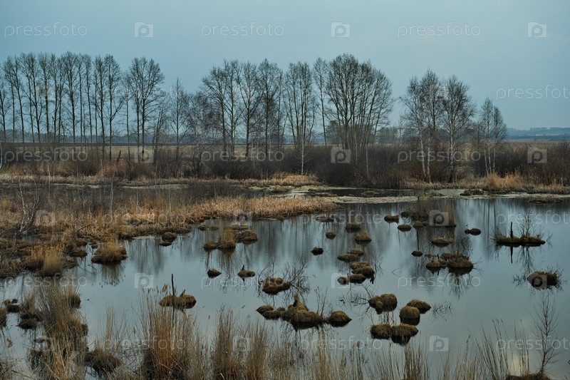 Россия. Юг Западной Сибири. Весенний вид на затопленное талой водой болото, заросшее кустами