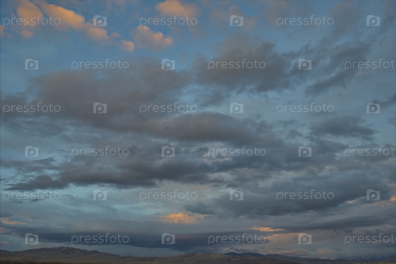 Россия. Юг Западной Сибири. Облака, освещенные заходящим солнцем в вечернем небе над бескрайними полями Алтая