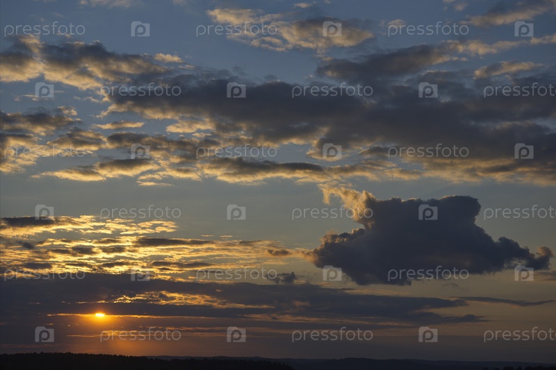 Россия. Юг Западной Сибири. Облака, освещенные заходящим солнцем в вечернем небе над бескрайними полями Алтая