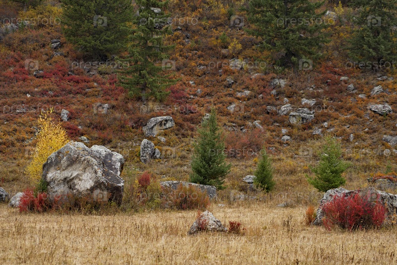 Россия. Юг Западной Сибири, Горный Алтай. Начало осени на живописных скалистых россыпях Курайской степи по Чуйскому тракту