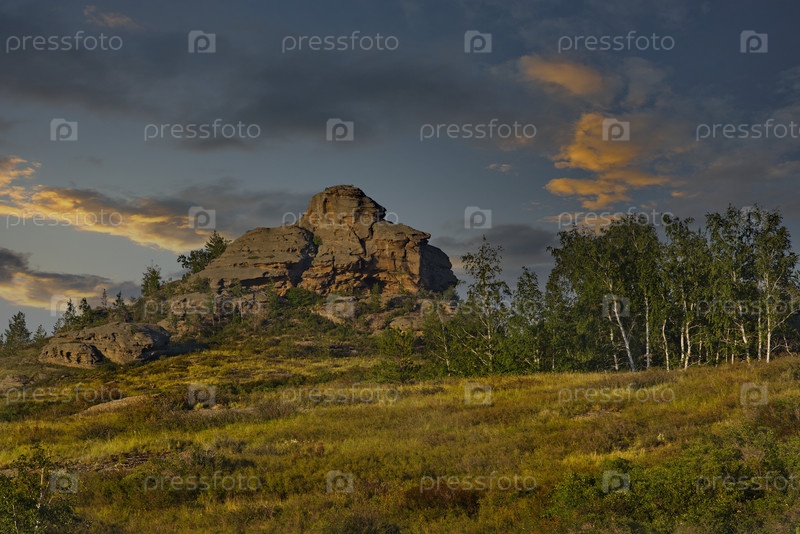 Россия. Алтайский край. Живописные скальные обнажения на берегу озера Колывань, расположенного недалеко от границы с Казахстаном, на фоне яркого закатного неба