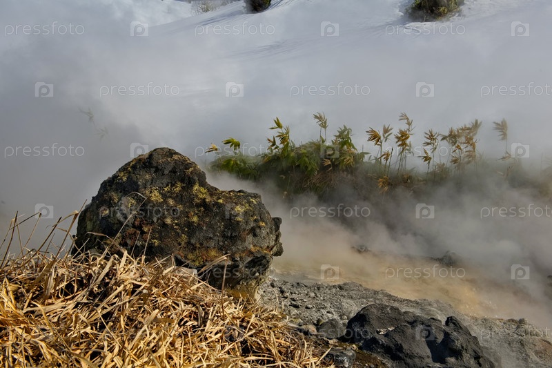 Россия. Курильские острова. Живописный плавучий термальный источник (Кипящая река) возле вулкана Барановского на острове Итуруп, температура воды которого у истока достигает 80 градусов