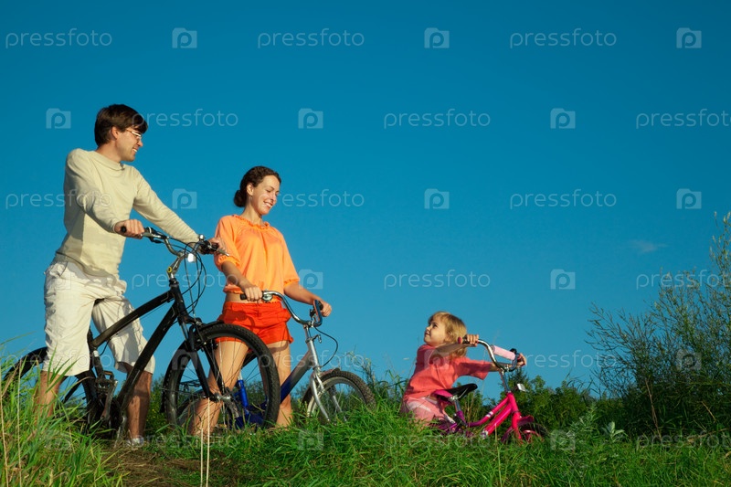 Семья из трех человек на велосипедах в парке в солнечный день