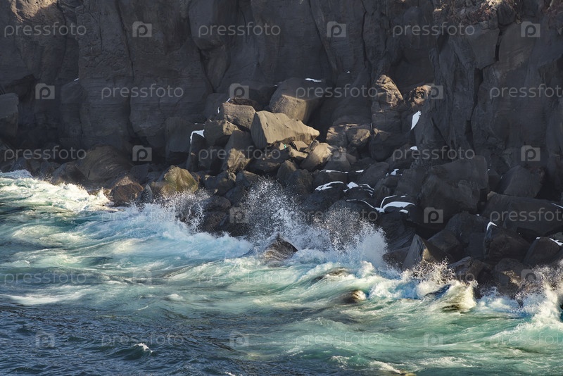 Россия. Дальний Восток, Курильские острова. Очень твердые и острые базальтовые скалы вдоль побережья Охотского моря на острове Итуруп