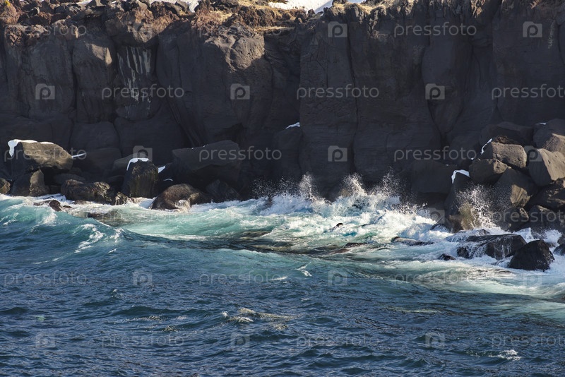 Россия. Дальний Восток, Курильские острова. Очень твердые и острые базальтовые скалы вдоль побережья Охотского моря на острове Итуруп