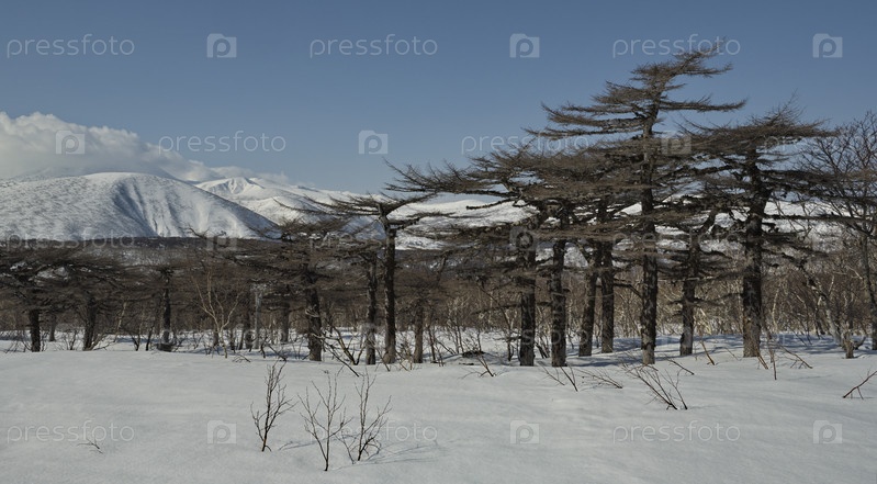 Россия, Дальний Восток, Курильские острова. Причудливые лиственницы и корявые каменные березы в окружении бамбука на фоне заснеженных вулканов