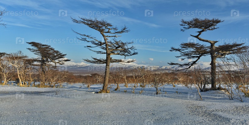 Россия, Дальний Восток, Курильские острова. Причудливые лиственницы и корявые каменные березы в окружении бамбука на фоне заснеженных вулканов