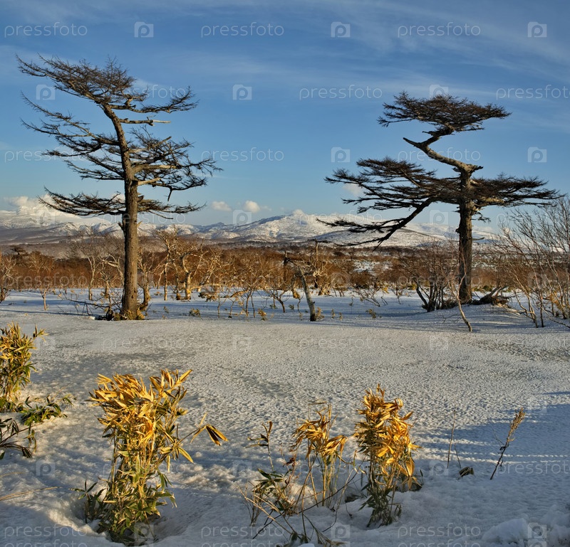 Россия, Дальний Восток, Курильские острова. Причудливые лиственницы и корявые каменные березы в окружении бамбука на фоне заснеженных вулканов