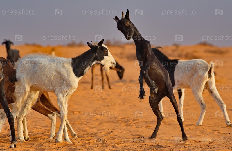 Западная Африка. Мавритания. Молодые козочки небольшого стада, высоко поднявшись на задние лапы, выясняют отношения на пастбище в пустыне Сахара