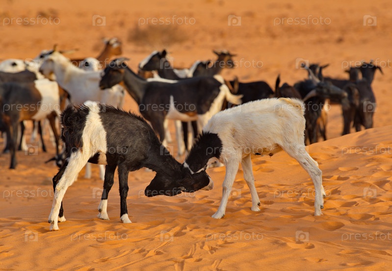 Западная Африка. Мавритания. Молодые козочки небольшого стада, высоко поднявшись на задние лапы, выясняют отношения на пастбище в пустыне Сахара