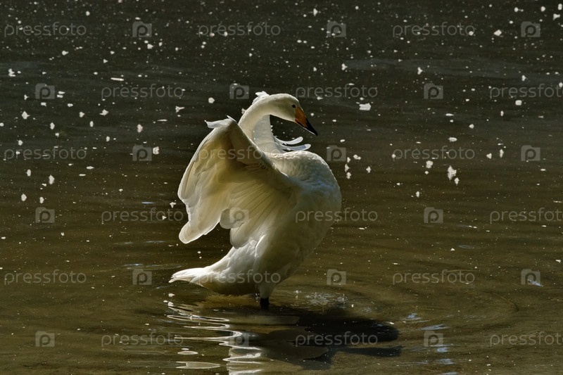 Россия. Новосибирский зоопарк имени Ростислава Шилова. Белый лебедь-кликун расправляет крылья в лучах вечернего солнца
