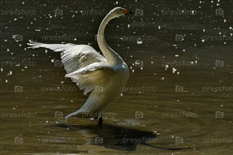 Россия. Новосибирский зоопарк имени Ростислава Шилова. Белый лебедь-кликун расправляет крылья в лучах вечернего солнца