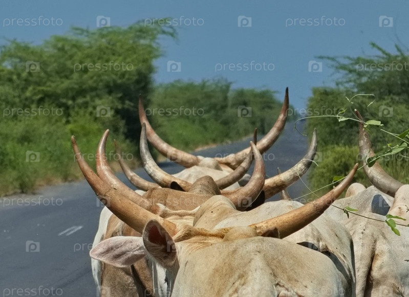 Западная Африка. Сенегал. Стадо коров зебу с большими богато украшенными рогами движется по шоссе на водопой к ближайшему озеру