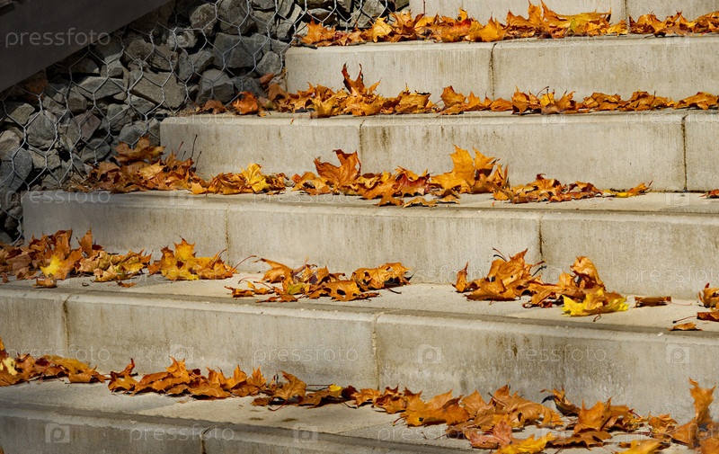 Россия. Москва, парк Покровское-Стрешнево. Опавшие желто-золотые кленовые листья на ступеньках парадной лестницы возле центрального фонтана