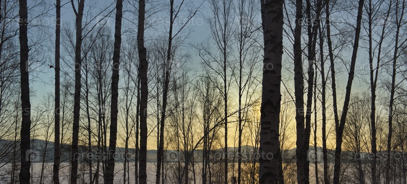 Россия. Западная Сибирь. Живописный частокол из стройных берез на берегу озера Парнушки прохладным вечером ранней весной