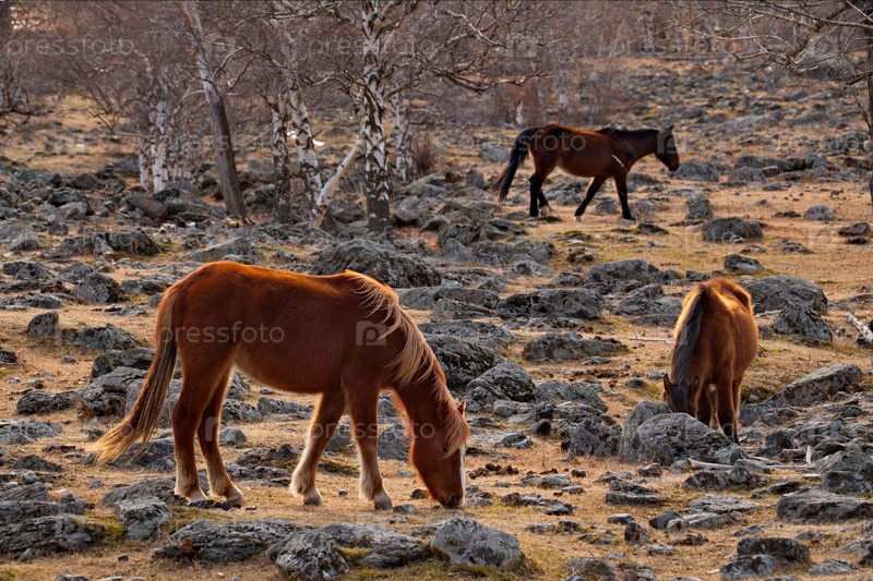 Россия. горный Алтай. Лошади выносливой алтайской породы мирно пасутся в каменных степях со скудной растительностью