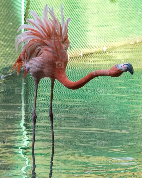 Россия. Новосибирский зоопарк имени Ростислава Шило. Розовый фламинго в открытом вольере богатого планктоном озера зоопарка
