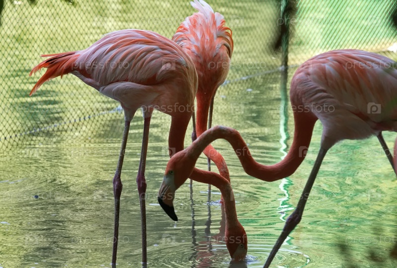 Россия. Новосибирский зоопарк имени Ростислава Шило. Розовый фламинго в открытом вольере богатого планктоном озера зоопарка