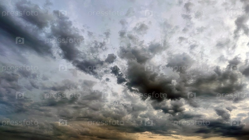 Облачное небо с грозовыми тучами. Низкие кучевые облака различной формы закрывают почти все небо. Они находятся на разной высоте и имеют разные цвета: белый, светло-серый и темно-синий