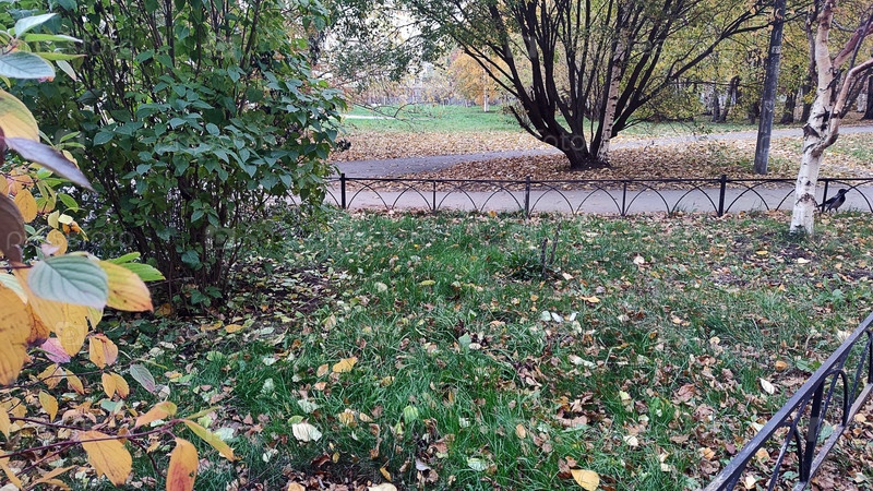 Осенний парк с металлическим забором. Осенний день небольшая городская площадь, где на зеленой лужайке растут деревья и кусты. Листья начинают желтеть. Дорожки в парке огорожены