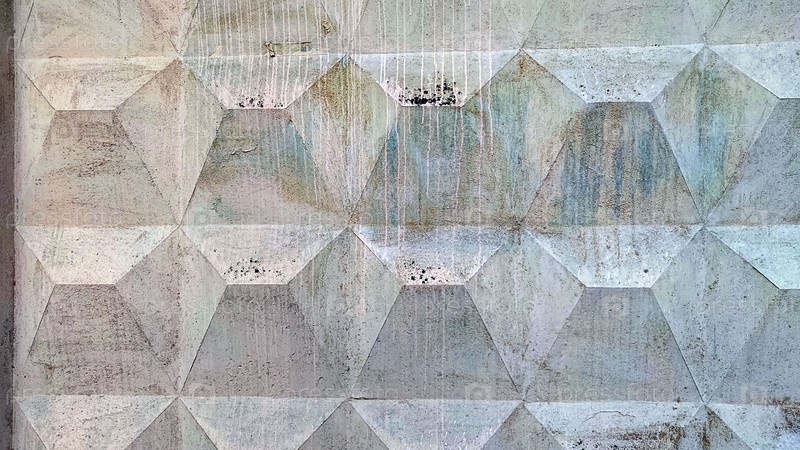 Часть бетонной текстурной стены забора. Грубая цементная поверхность, состоящая из квадратных повторяющихся фигур в виде прямоугольных пирамид. Поверхность светло-серая с подтеками от воды